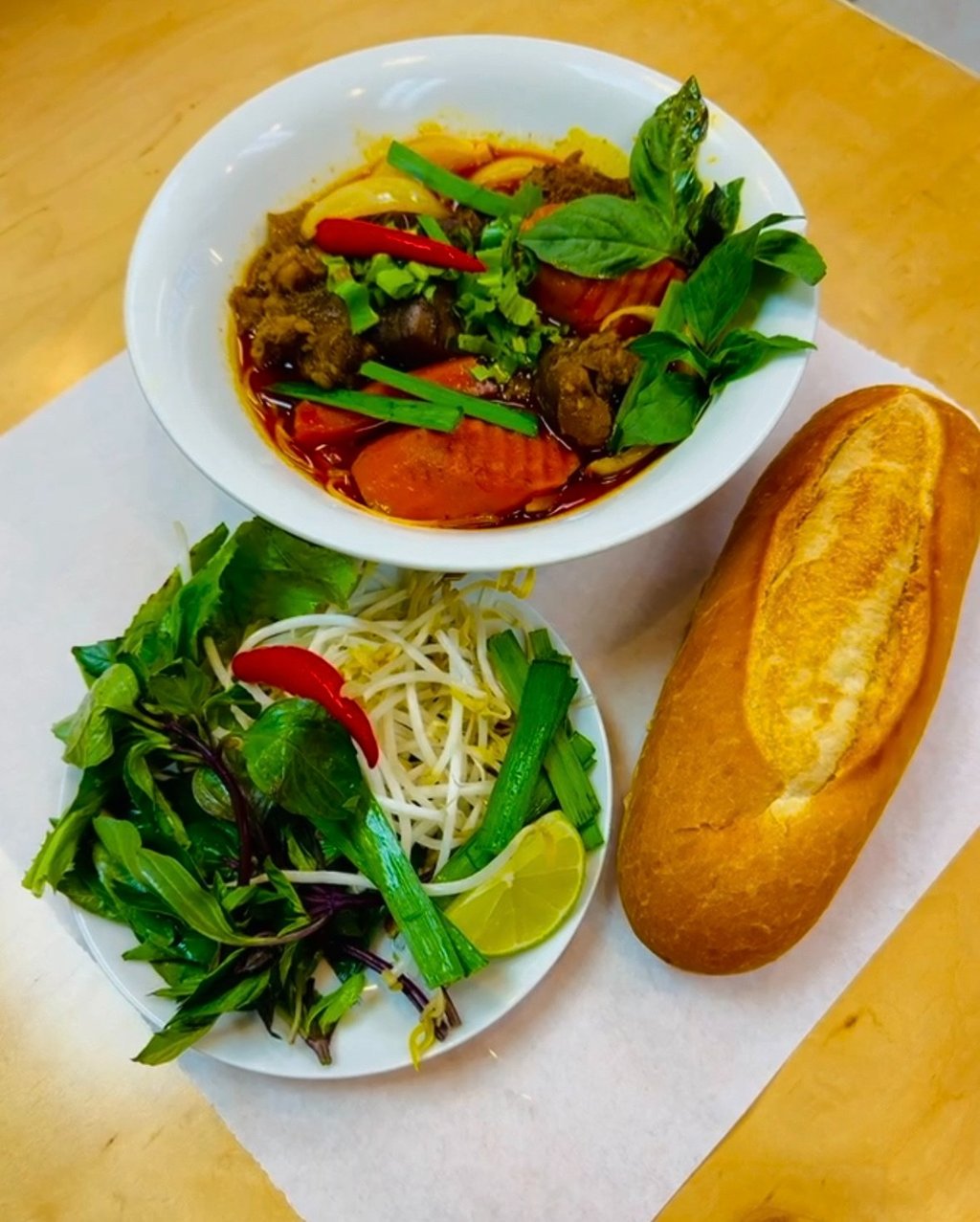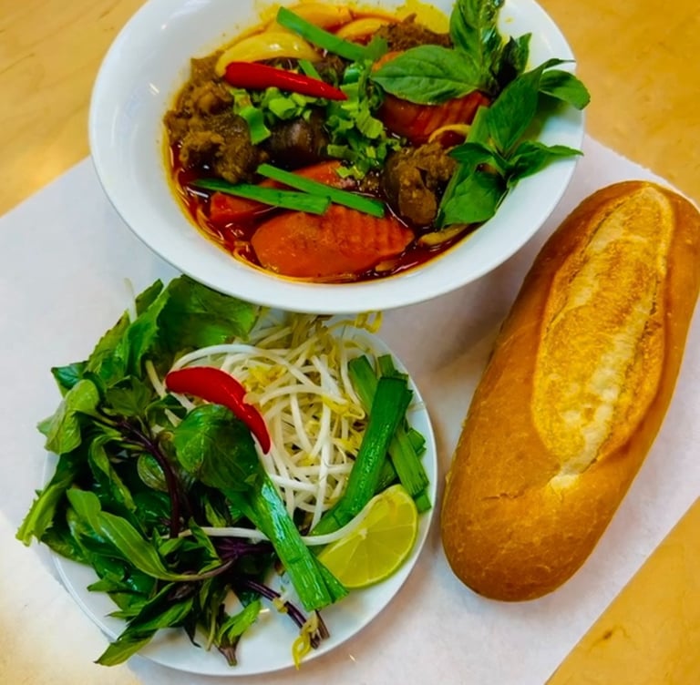 Vietnamese beef stew made with tender beef simmered in fragrant and delicious broth, our stew includes carrots, onions and various herbs. Served with either our baguette or noodles