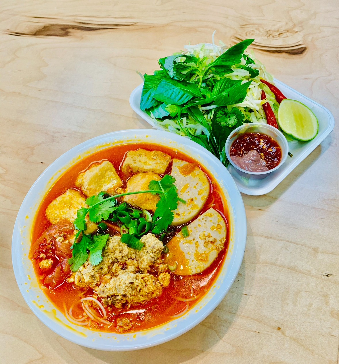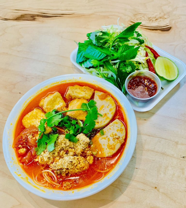Delicious Vietnamese rice noodle soup, a tangy tomato based soup, includes tofu, pork, and rieu made from pork, crab and egg mixture. This dish is garnished with fresh herbs and a squeeze of lime