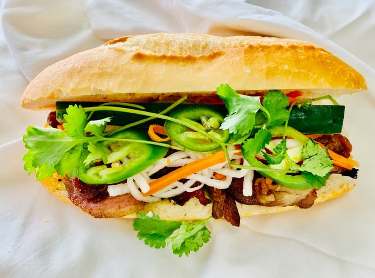 Crispy baguette filled with marinated pork, pickled vegetables, cilantro, fresh jalapenos, seasoned with soy sauce and our house mayo
