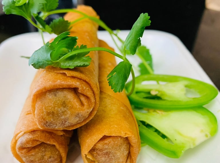 Crispy golden rolls made from a filling of savory minced chicken and vegetables, wrapped in egg roll wrappers, and served with our fish sauce